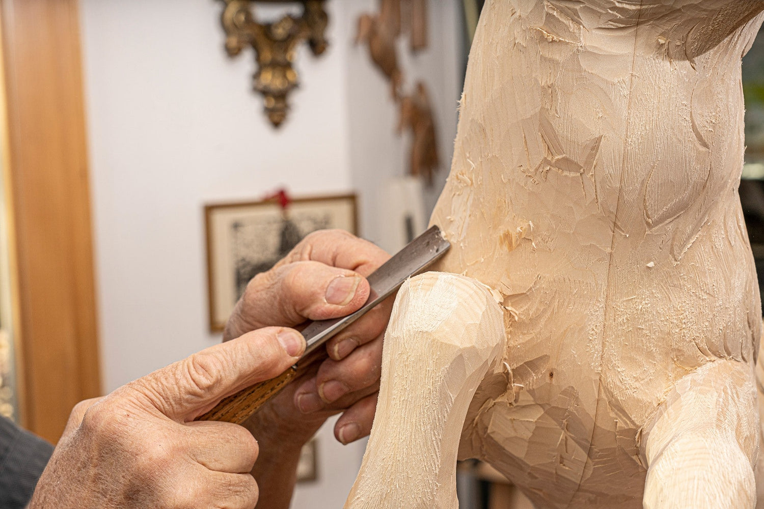 Our carvers don't just make figures of saints, angel putti, coats of arms or nativity figures. At the customer's request, a bodybuilder was carved by a wood carver from Ortisei in Val Gardena. To protect the sculpture, a wax was applied after carving to protect the wood.