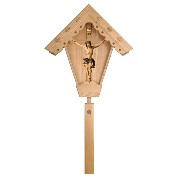 Die Grödner Holzschnitzerei Feldkruzifix Nazarener Lärche wird nach dem Entwurf eines Bildhauers mit viel Liebe und hohem holzschnitzerei handwerklichen Anteil gefertigt, wodurch jede holzgeschnitzte Figur ein geschnitztes Unikat ist. Durch die Handbemalung der geschnitzten Holzfigur können geringfügige Abweichungen zur Abbildung vorliegen.