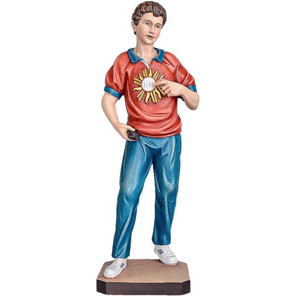 The Val Gardena wood carving of Saint Carlo Acutis is crafted according to a sculptor's design with great care and a high degree of craftsmanship, making each carved wooden figure a unique piece. Due to the hand-painting of the carved wooden figure, slight variations from the illustration may occur.