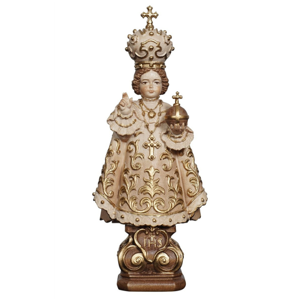 The Val Gardena wood carving Prague Infant Jesus Baroque is made according to a sculptor's design with a lot of love and a high level of craftsmanship, which means that each wood carved figure is a unique piece. Due to the hand painting of the carved wooden figure, there may be slight deviations from the picture.