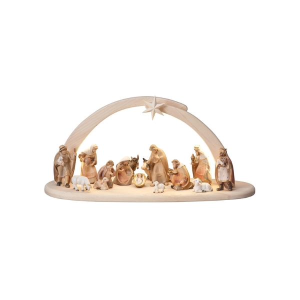 Die Grödner Holzschnitzerei Pema Krippenset 16 teilig im Stall Leonardo beleuchtet wird nach dem Entwurf eines Bildhauers mit viel Liebe und hohem holzschnitzerei handwerklichen Anteil gefertigt, wodurch jede holzgeschnitzte Figur ein geschnitztes Unikat ist. Durch die Handbemalung der geschnitzten Holzfigur können geringfügige Abweichungen zur Abbildung vorliegen.